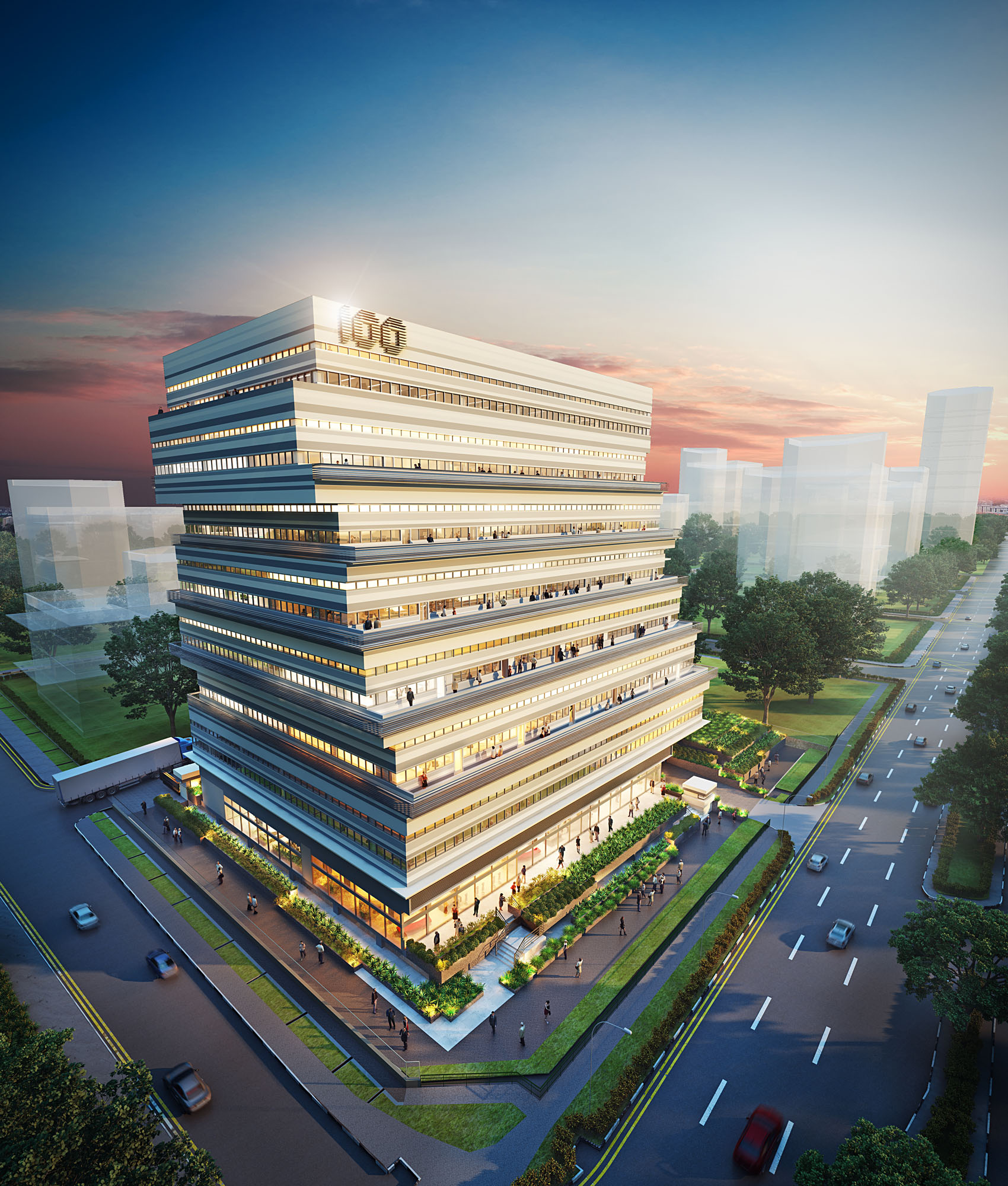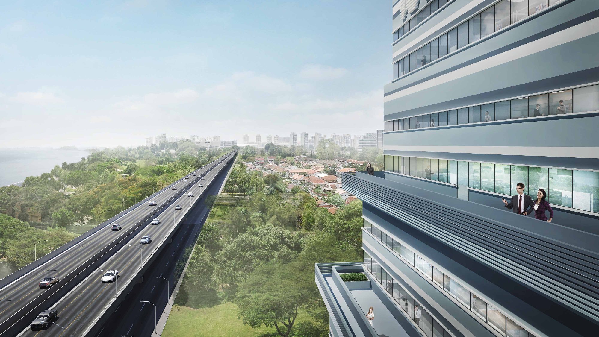 Its outstanding presence is achieved by staggering a series of dynamic blocks one above the other, creating a striking profile against the skyline. Stepped balconies introduced across different floor levels allow the building to appear as if it is shifting away from the busy elevated highway.