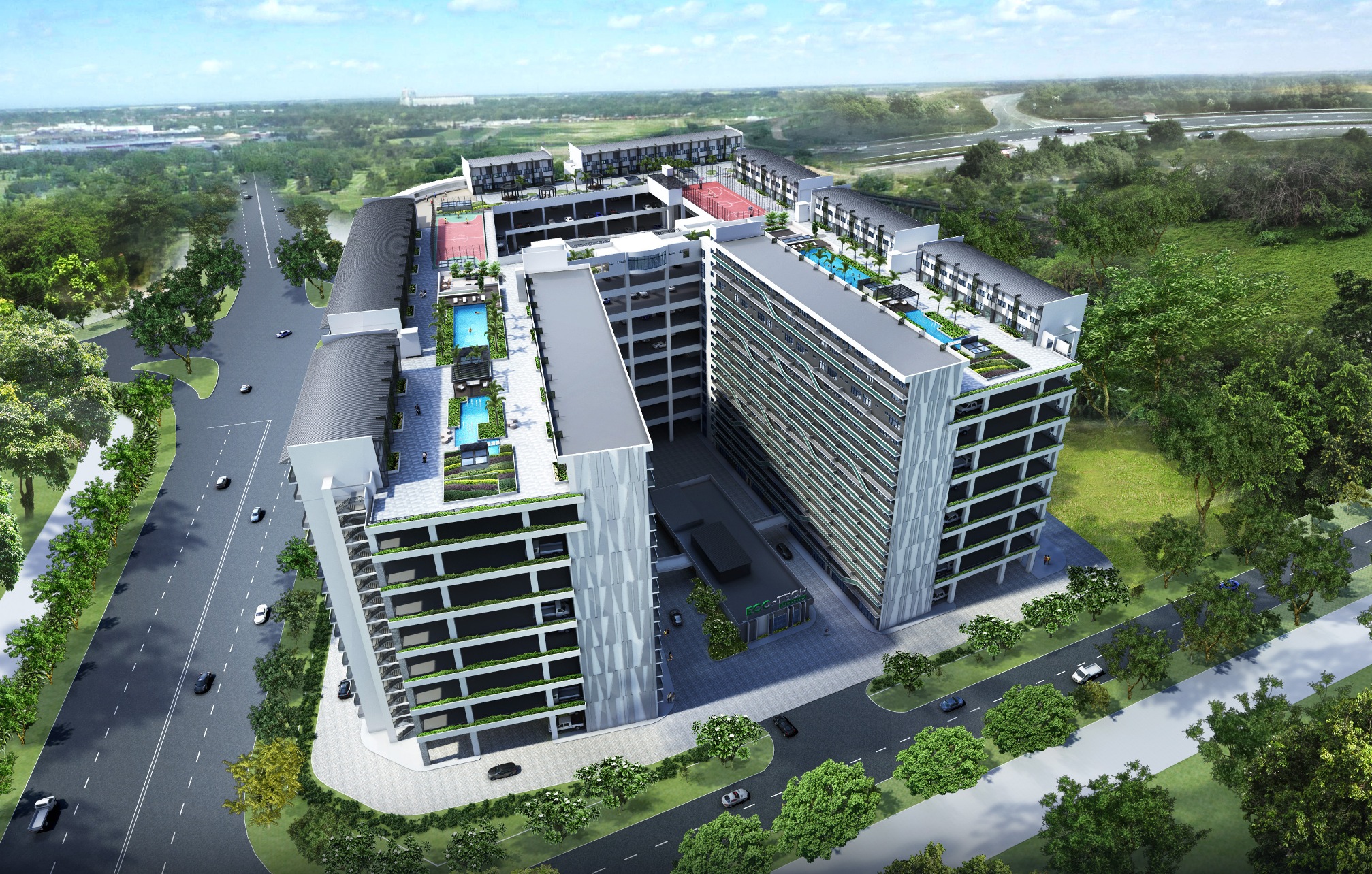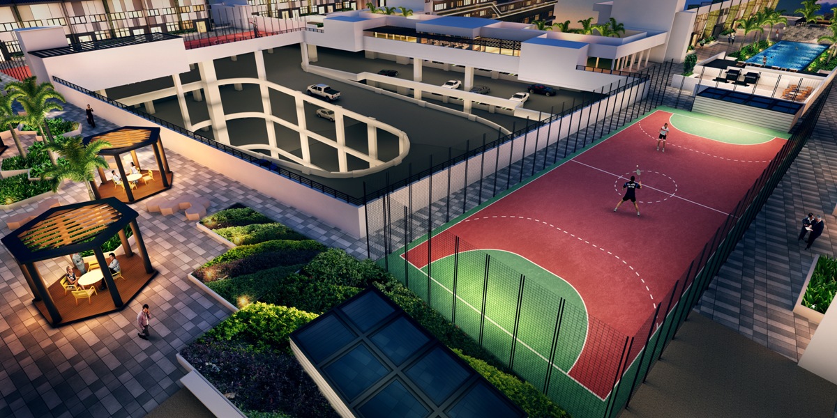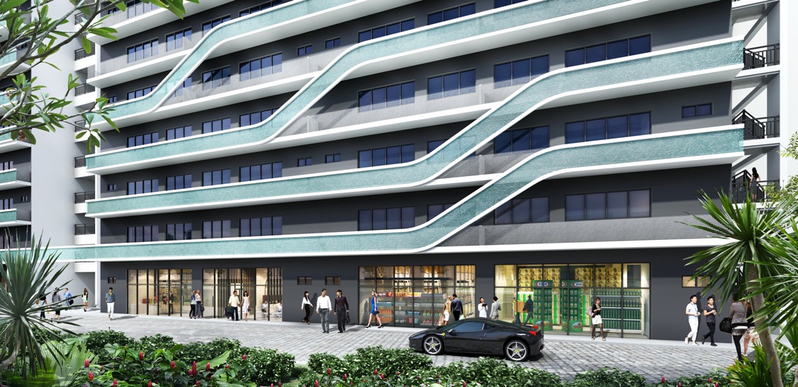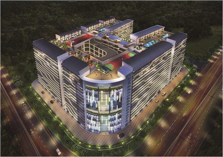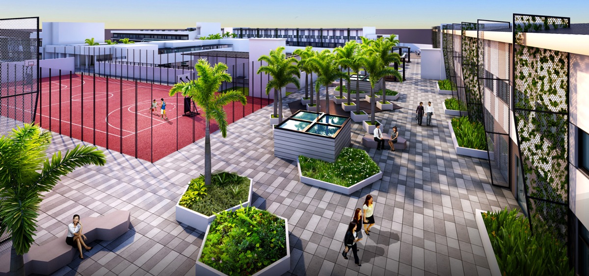 The facade consists mainly of glass curtain walls and perforated panels in dynamic patterns. Lush green gardens and sporting facilities such as swimming pool, gym, basketball court and game court are provided on the roof.
