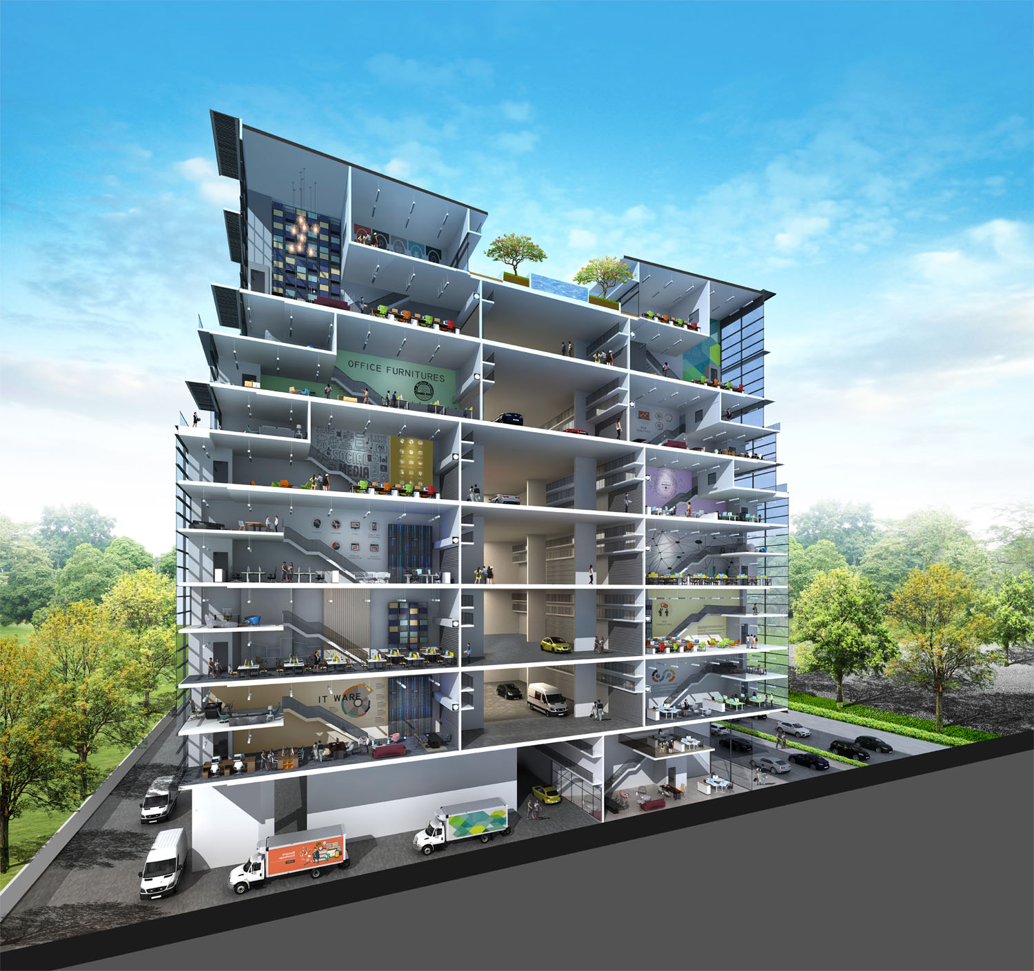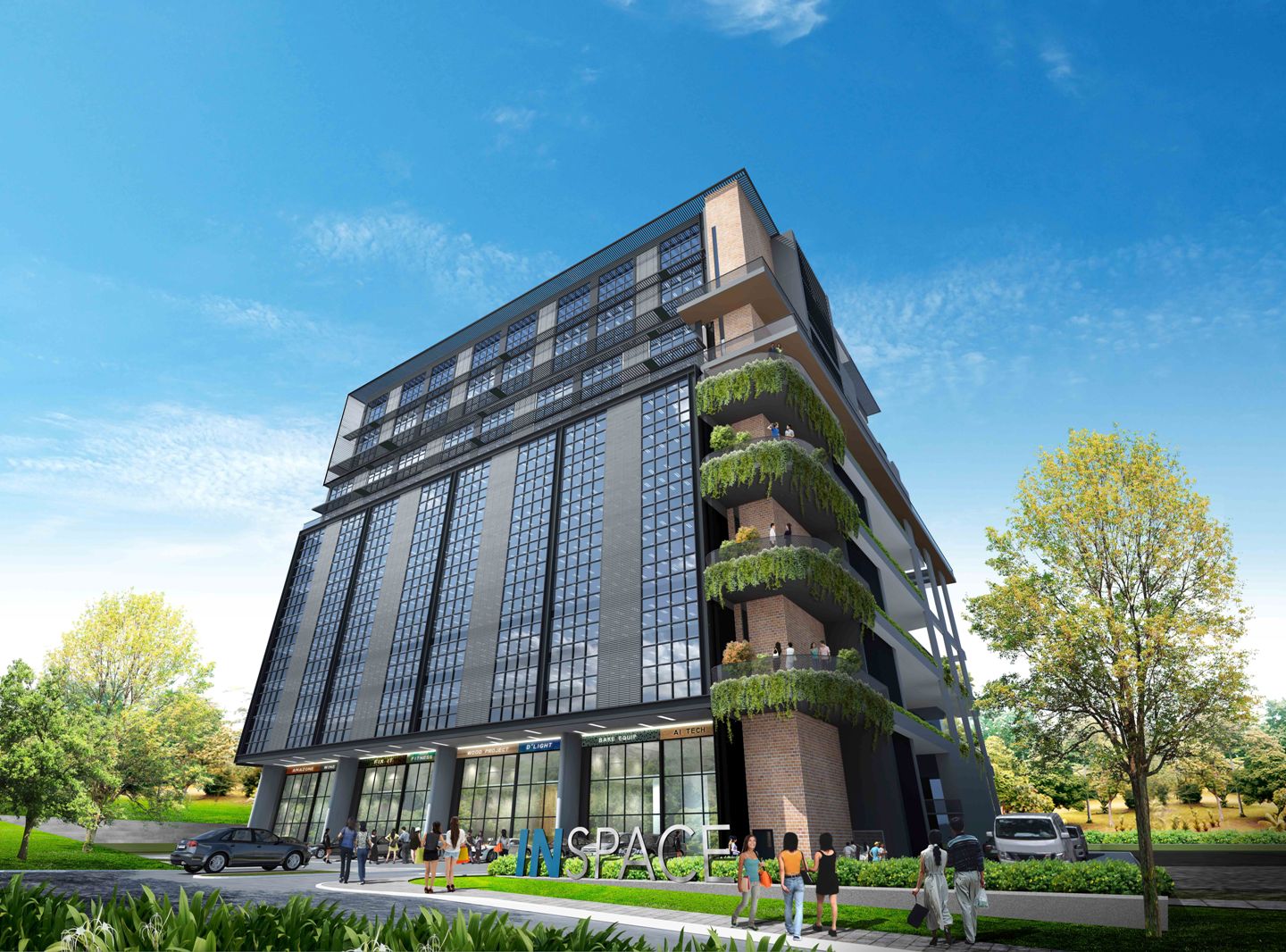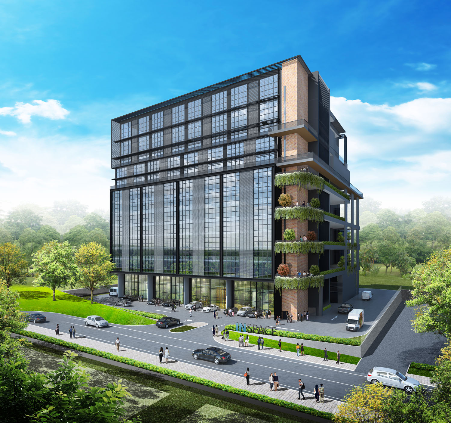 Lush gardens with amenities such as barbeque pits, swimming pool and fitness areas are provided on the roof to improve the work life balance of users. Discussion spaces are provided at different corners of the development to encourage interaction and collaboration.