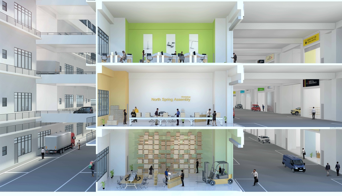 A vehicular ramp serving 40 foot containers allow loading and unloading to be carried out on upper storeys. Factory layout are modular with a variety of unit sizes, high floor loading and column-free. For selected units, dual access and glass frontage are provided.
